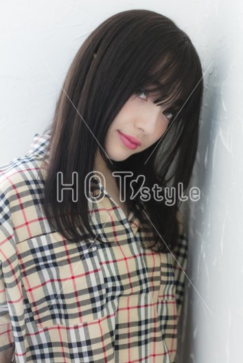 前髪からサイドにかけてラウンドに切り込んだサラツヤストレートで雰囲気のある今どきロングヘアに