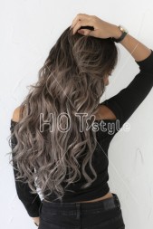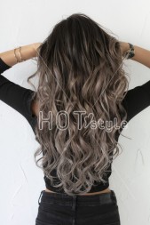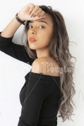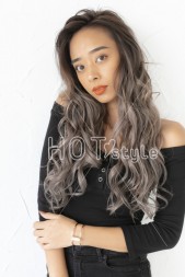 高めの位置からブリーチでグラデーションをつける。根本近くはダーク系のアッシュを使用、ブリーチの部分は10トーンのブルーとパープルでスモーキーなグレージュに。エクステはライトグレーを使用。
