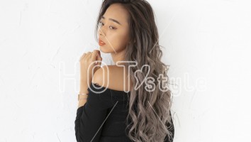 32mmのコテで全体をスパイラルに巻いて手グシを通す。顔回りはリバースに巻いてこなれた感じに。オイルトリートメントでツヤ感をプラス。