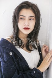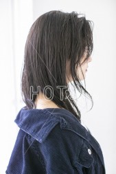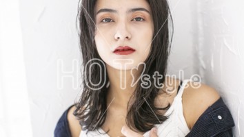 根元がふんわり立ち上がるように乾かしながら、毛先が外向きになるようにドライして、32mmのコテでリバースに巻く。シアバターとオイルを混ぜてウェット感が出るように。