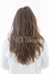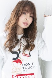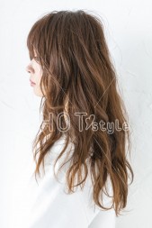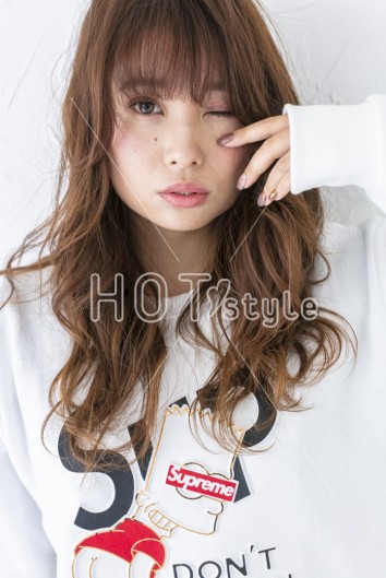 レイヤーの入った胸ラインのロングスタイル。前髪が重くならないように少し薄くカットする。パーマは17mm、20mm、23mmを使って平巻きと逆巻きをミックス。