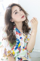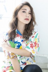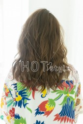 32ミリのアイロンでミックス巻き、仕上げに中間から毛先にヘアオイルをなじませる。