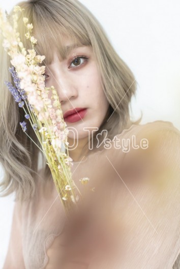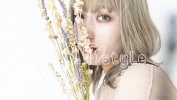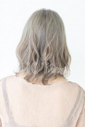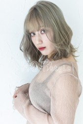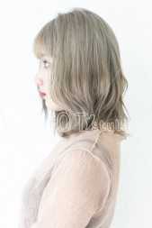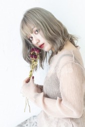 肩下ぐらいのラインでカット。表面にレイヤーを入れて、バングを目にかかるぐらいにカット。ブリーチで明るくしてから、ライトグレージュでオンカラー。
