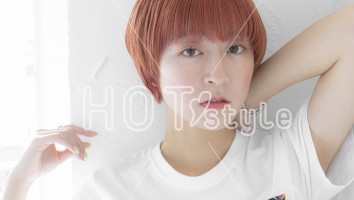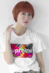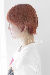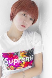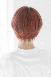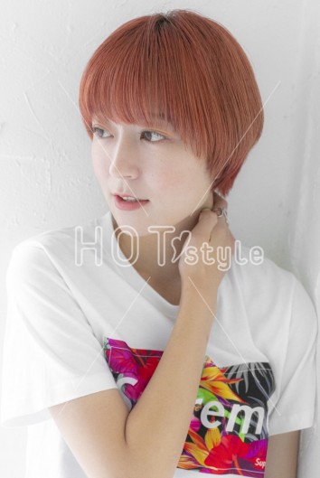 重さを低めに設定しグラデーションでカット、襟足は浮かない長さで調節。8トーンのカッパーオレンジで鮮やかに。