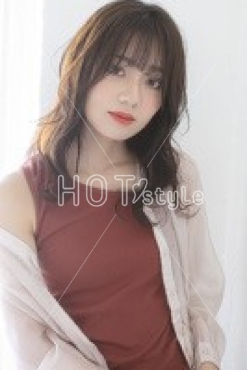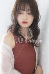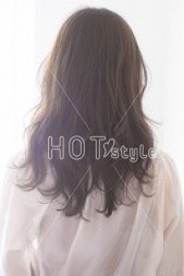 32ミリのカールアイロンでゆるい波巻き、表面をポイントで巻き動きを出して。グロススプレーを全体的につける。