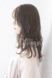 全体をローレイヤーベースでカット、バングを薄めに後れ毛を作る。8レベルのオリーブベージュでツヤ感をだす。