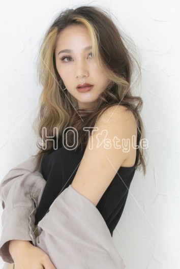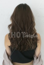 カールアイロンで全体をスパイラル巻きにし、顔周りはリバース。オイルスプレーでツヤツヤにセット。