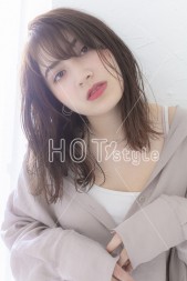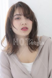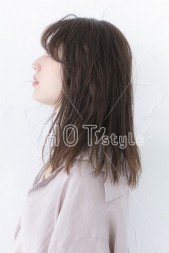 全体をラフにドライしバングのみストレートアイロンで毛先を流す。スタイリングオイルを中間から毛先に揉みこむ。