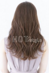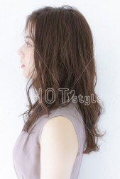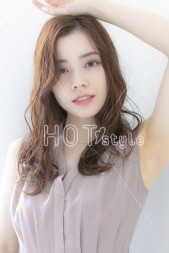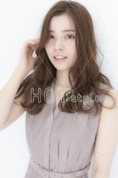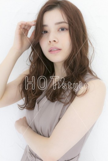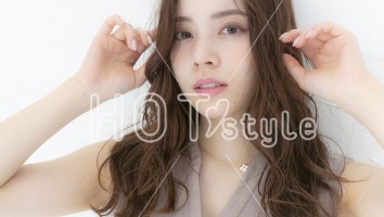 鎖骨下15cmのフラットなカットで、前髪からつながるレイヤーを入れる。中間から20ミリのロッドでランダムにミックス巻き。