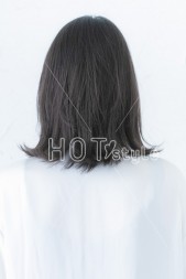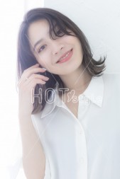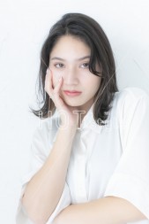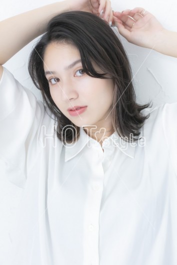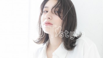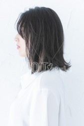肩にかかるラインでカットし、顔まわりとトップにレイヤーを入れる。7トーンのオリーブグレージュでに抜け感を出す。
