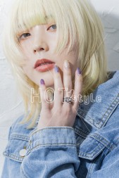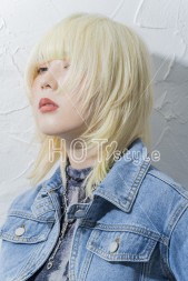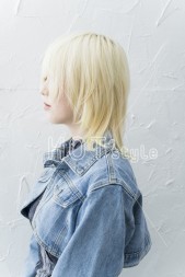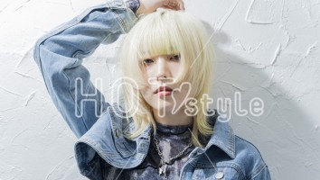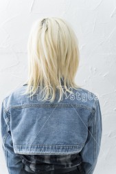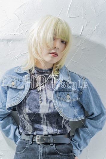 襟足は肩より下で、前髪は目ギリギリでラインを出す。フェイスレイヤーを頬の位置から入れ、タイトな感じにする。ブリーチで18レベルまで明るくする。