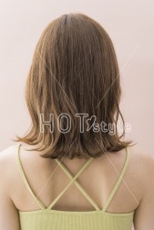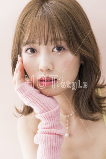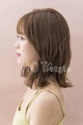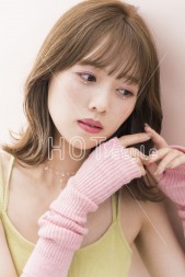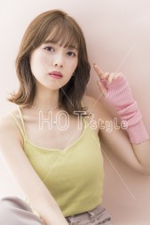 肩ラインでやや前下がりにブラントカットし、表面にレイヤーを入れる。カラーは10レベルのグレージュに少しピンクを混ぜ、ツヤと透明感をアップ。