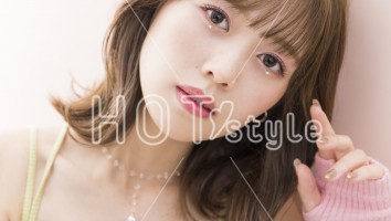 ドライ後、32ミリのカールアイロンで毛先を外ハネ、後れ毛と前髪は内巻きにする。顔まわりとトップはリバースにし、セミウェットのヘアオイルをもみ込む。