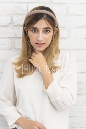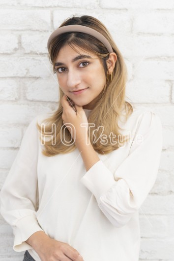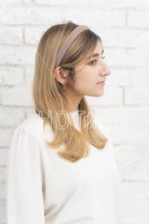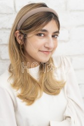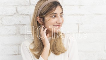 ラフにドライし毛先を外ハネ、中間を軽く半カール内巻きにしカチューシャをつける。