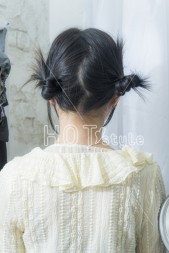 バックの髪を半分に分け、下よりの場所でお団子を作り、毛先は外に出す。