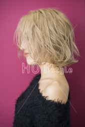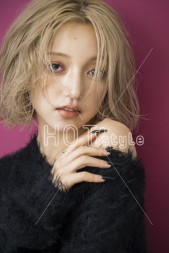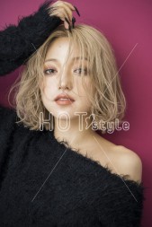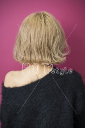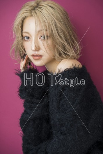 ラフにドライし、襟足は外ハネに巻く。サイドをランダム巻きしてウェット系のスタイリングをつける。
