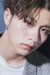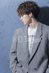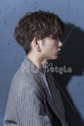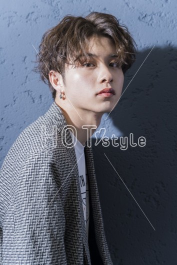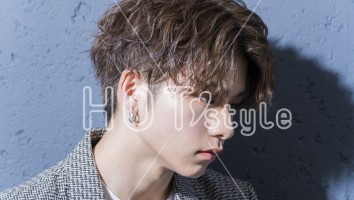 サイドにツーブロックを入れ、マッシュベースでカットする。ツイストパーマをランダム巻きにし、縦落ちになるように調整。