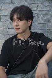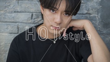 トップにボリュームが出るようにドライし、アイロンでセンターパートを作る。根元からワックスをもみ込んで流れるようにセットする。