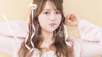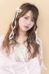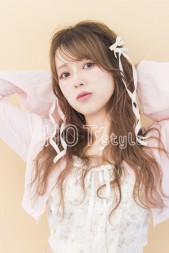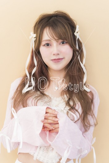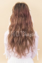 ロングヘアに波ウェーブスタイル。前髪を流しめにカットしサイドバングは長めに設定する。リボンとの相性も抜群♬