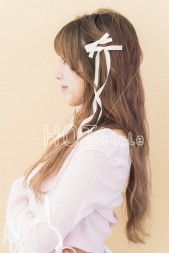 32ミリのコテで波巻きしスプレーでセットする。両サイドに紐でリボンをつけて完成。