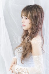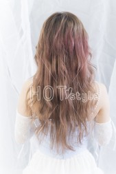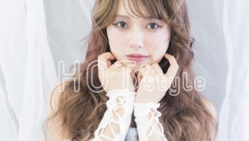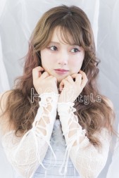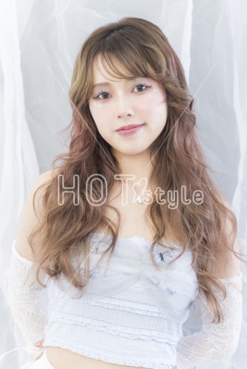 全体を波巻きし、顔まわりをリバースでまとまりを出す。オイルをつけてツヤ感をプラス。